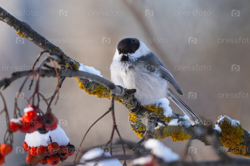 Птица Parus montanus или ивовая синяжка, распускающая перья в суровые морозы, сидит на ветке красной ребинки, покрытой снегом крупным планом