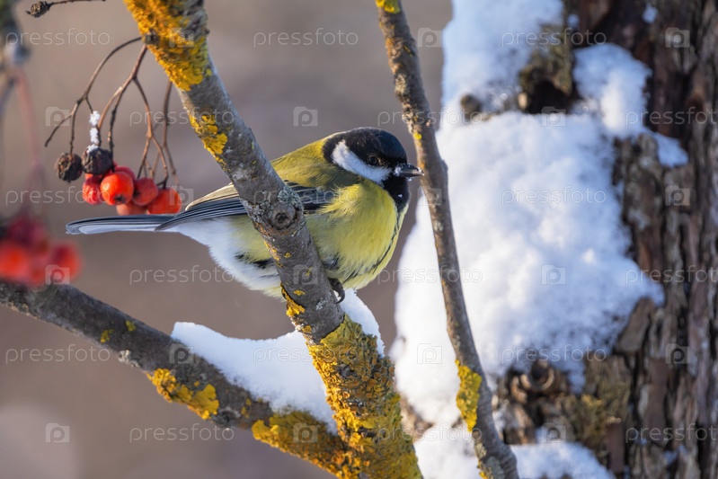 Птица Парус большое зимнее утро сидит на ветке красной рябины, покрытой снегом крупным планом