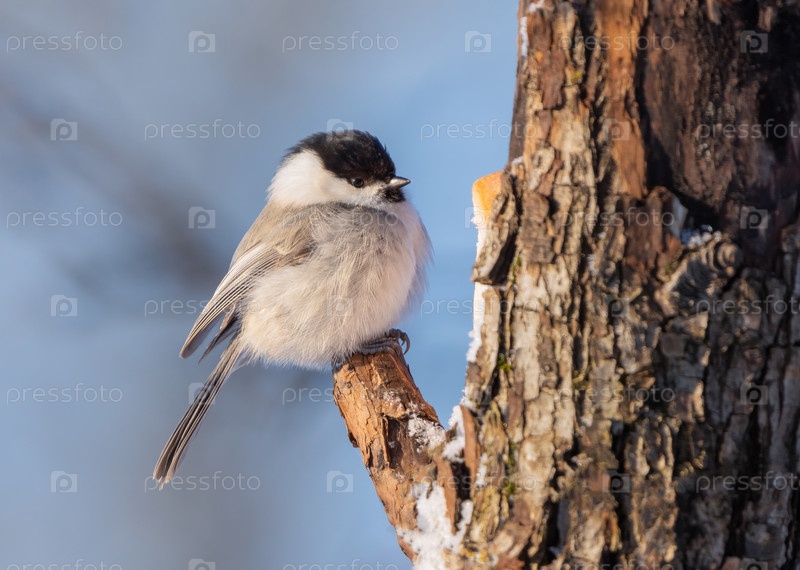 Птица Parus montanus или еловая синяжка, распускающая перья в суровые морозы, сидит на стволе дерева крупным планом