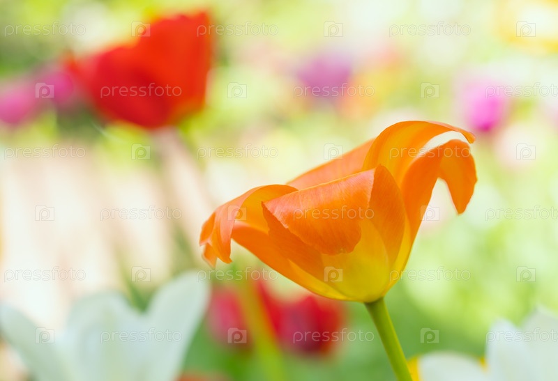 Оранжевый цветок тюльпана крупным планом на цветном размытом фоне