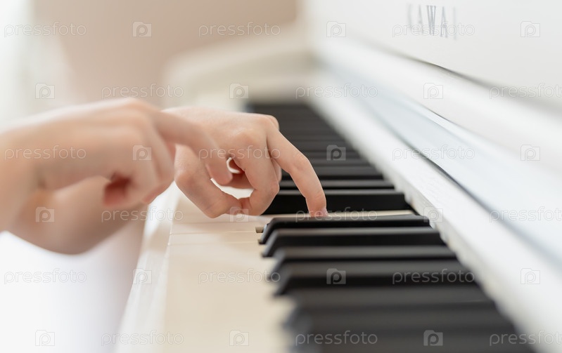 Руки мальчика играют на клавишах белого рояля крупным планом в светлой комнате