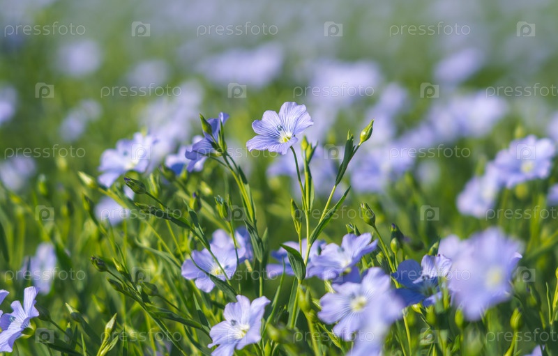 Голубые цветы цветущего льна солнечным утром крупным планом на льняном поле