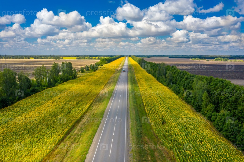Аэрофотосъемка прямой дороги, уходящей за горизонт, на обочине которой растут подсолнухи