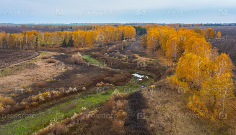 Аэрофотоснимок осенней природы, высохшая река в окружении желтых осенних деревьев во время листопада
