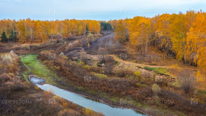 Аэрофотоснимок осенней природы, высохшая река в окружении желтых осенних деревьев во время листопада