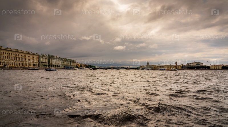 Панорама Санкт-Петербурга в непогоду, вид с русла Невы