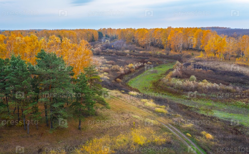 Аэрофотоснимок осенней природы, высохшая река в окружении желтых осенних деревьев во время листопада