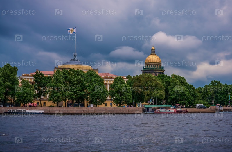 Вид с Невы на здание Адмиралтейства и Исаакиевский собор на фоне грозового неба