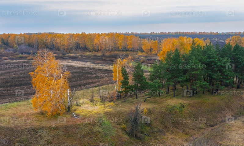 Серия фотографий осенней природы, вспаханных полей в окружении желтых осенних деревьев во время листопада