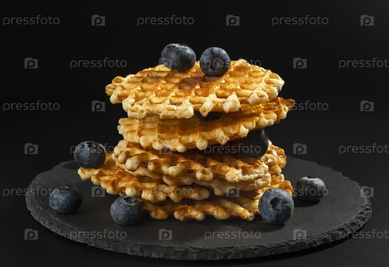 Свежие хрустящие с золотистой корочкой бельгийские вафли с черникой на черной каменной тарелке на черном фоне