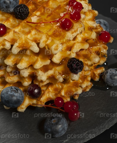 Свежие хрустящие бельгийские вафли со свежей черникой, ежевикой и красной смородиной, залитые свежим медом крупным планом