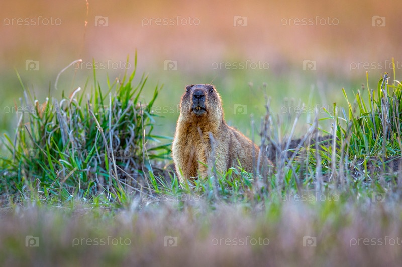 Сурок вылез из своей норы, чтобы погреться на весеннем солнышке, крупный план