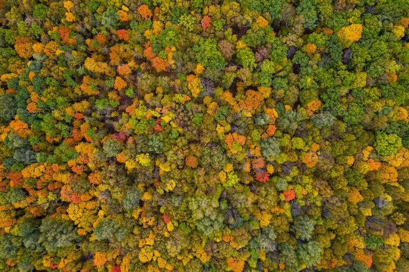 Аэрофотосъемка с квадрокоптера осенний красочный лес, красочные яркие шапки деревьев с высоты птичьего полета