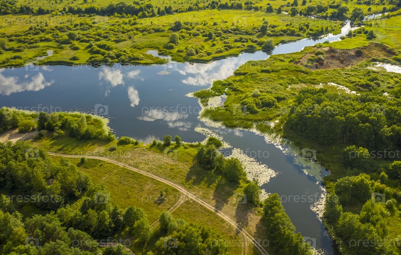 Вид с высоты птичьего полета на изгибы речных лугов и полей