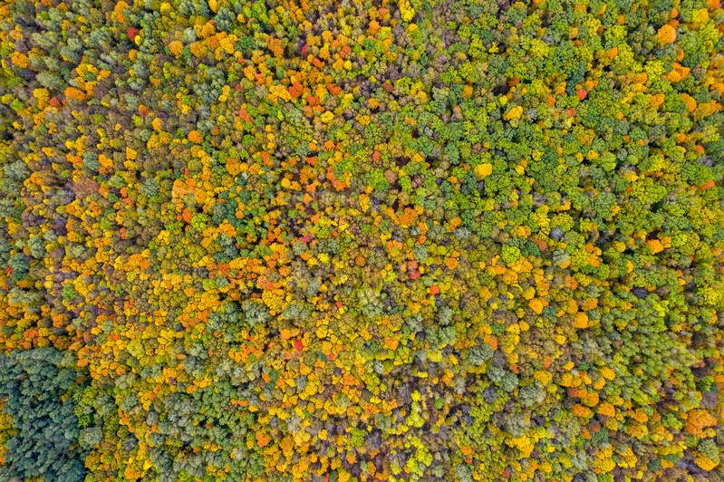 Аэрофотосъемка с квадрокоптера осенний красочный лес, красочные яркие шапки деревьев с высоты птичьего полета