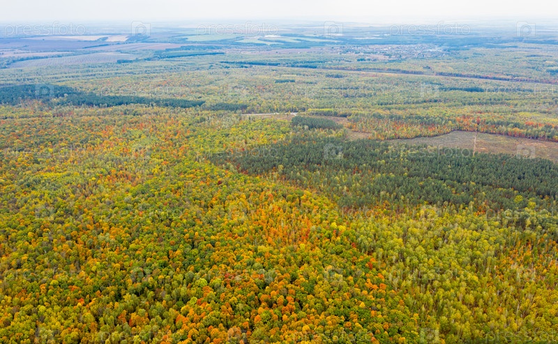 Аэрофотосъемка с квадрокоптера осенний красочный лес, красочные яркие шапки деревьев с высоты птичьего полета