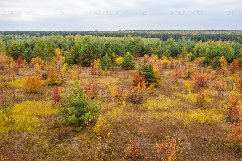 Аэрофотосъемка с квадрокоптера осенний красочный лес, красочные яркие шапки деревьев с высоты птичьего полета