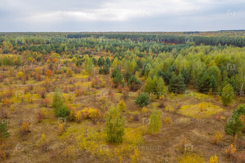 Аэрофотосъемка с квадрокоптера осенний красочный лес, красочные яркие шапки деревьев с высоты птичьего полета