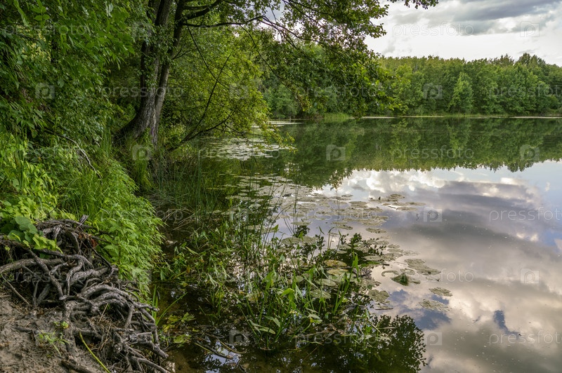 Лесное озеро вечером, отражающееся в водной глади неба с облаками и деревьями