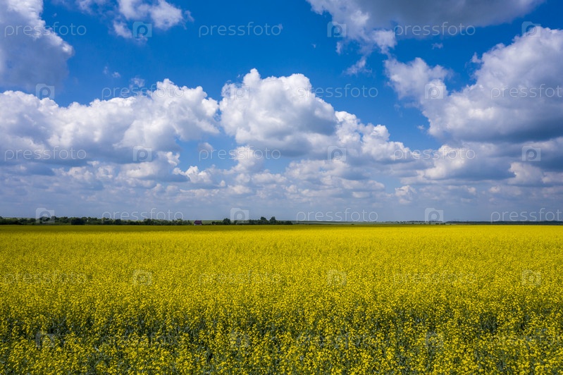 Поле цветет желтыми цветами рапса на фоне голубого неба с белыми перистыми облаками