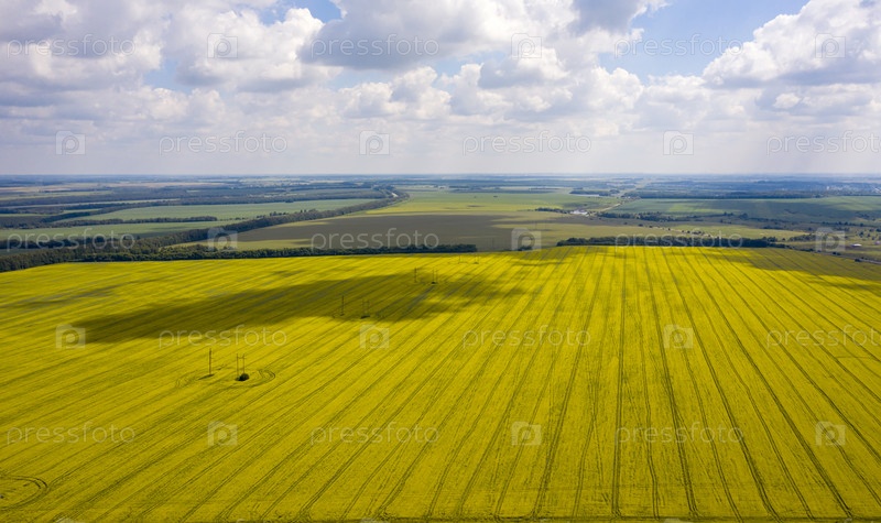 Вид с квадрокоптера на поле цветущего рапса с замысловатыми узорами плывущих по небу облаков