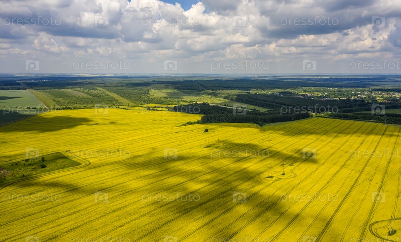 Вид с квадрокоптера на поле цветущего рапса с замысловатыми узорами плывущих по небу облаков