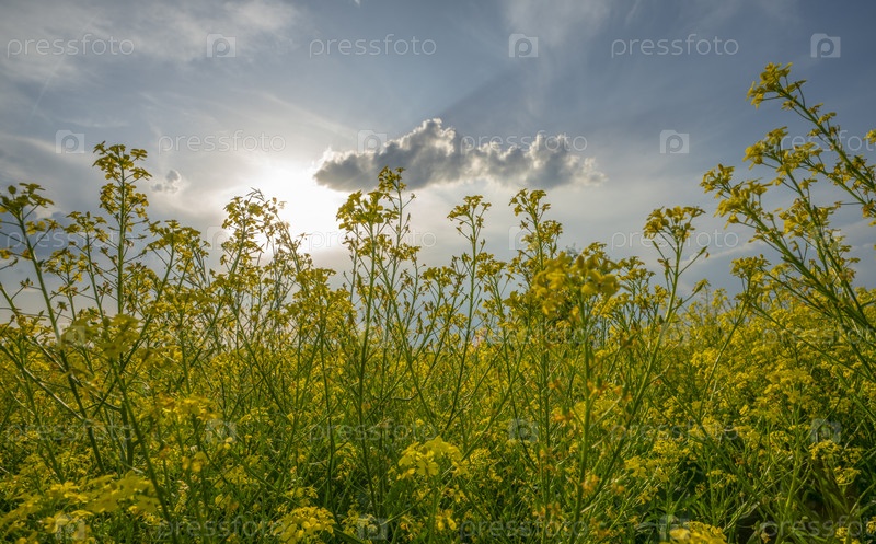 Поле цветет желтыми цветами рапса в свете контура на закате