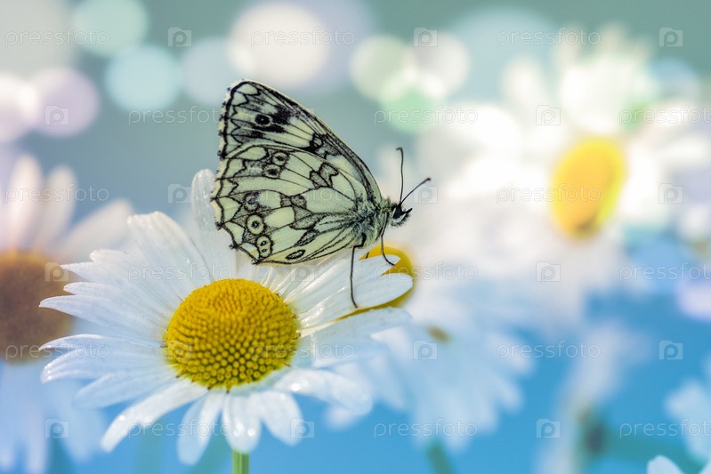 Весенняя открытка с бабочкой Галатея на ромашках и разноцветном фоне