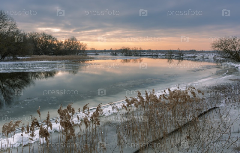 Прекрасный вечер на зимней реке, спокойная река на фоне заката