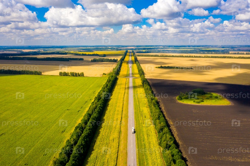 Аэрофотосъемка прямой дороги, где машины едут за горизонт, а на обочине растут подсолнухи