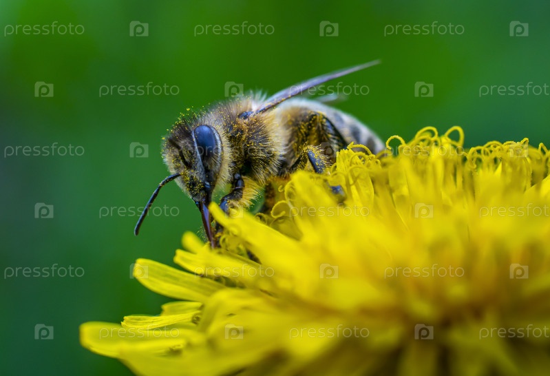 Крупный план пчелы, покрытой желтой пыльцой на ярко-желтом цветке одуванчика