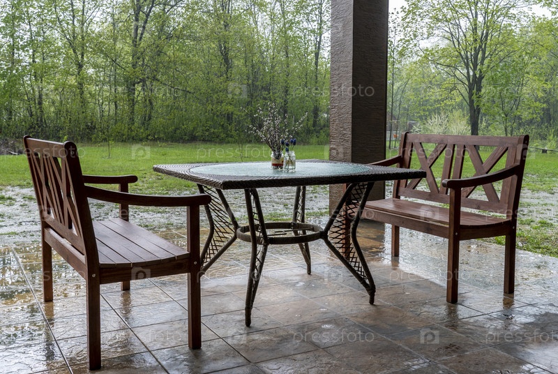 Две деревянные скамейки и стол стоят на открытой веранде во время сильного дождя