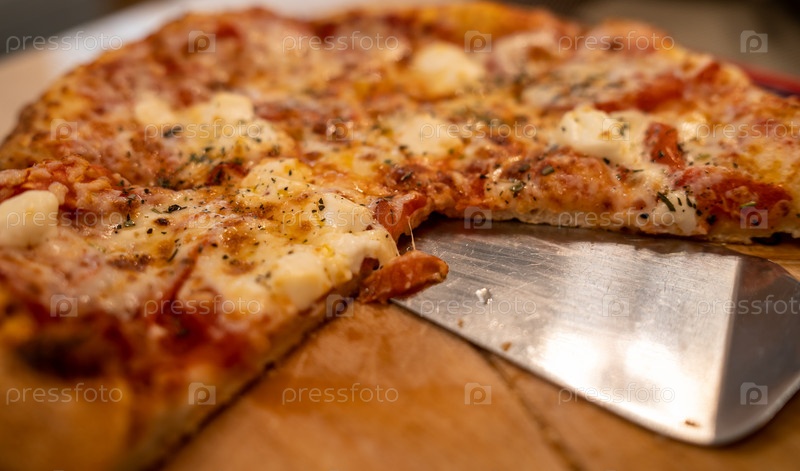 Горячая, сочная и вкусная пицца лежит на деревянной тарелке крупным планом