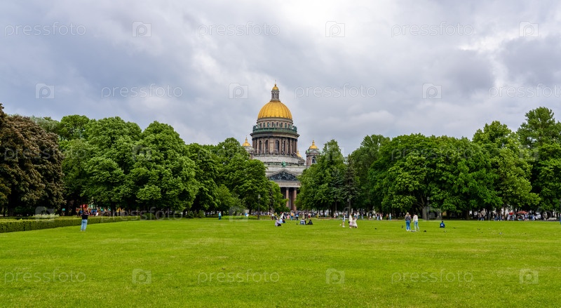Исаакиевская площадь в Санкт-Петербурге, на лужайке которой отдыхают люди на фоне Исаакиевского собора
