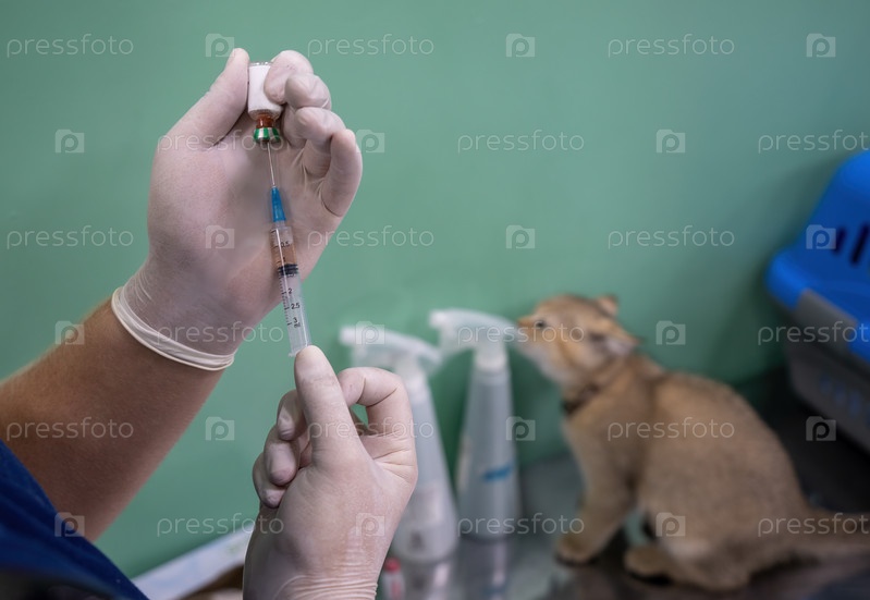 Ветеринар набирает вакцину в шприц, чтобы сделать укол котенку