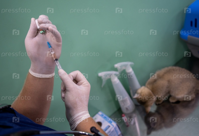 Ветеринар набирает вакцину в шприц, чтобы сделать укол котенку