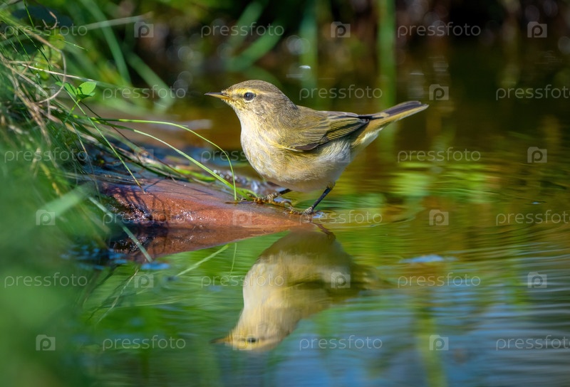 Обыкновенная птица-теньковка стоит на скале, торчащей из пруда, и смотрит на свое отражение