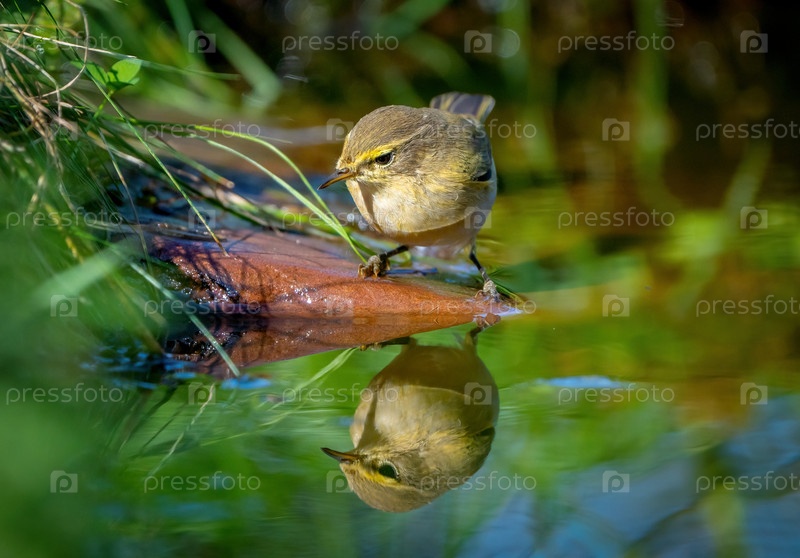 Обыкновенная птица-теньковка стоит на скале, торчащей из пруда, и смотрит на свое отражение