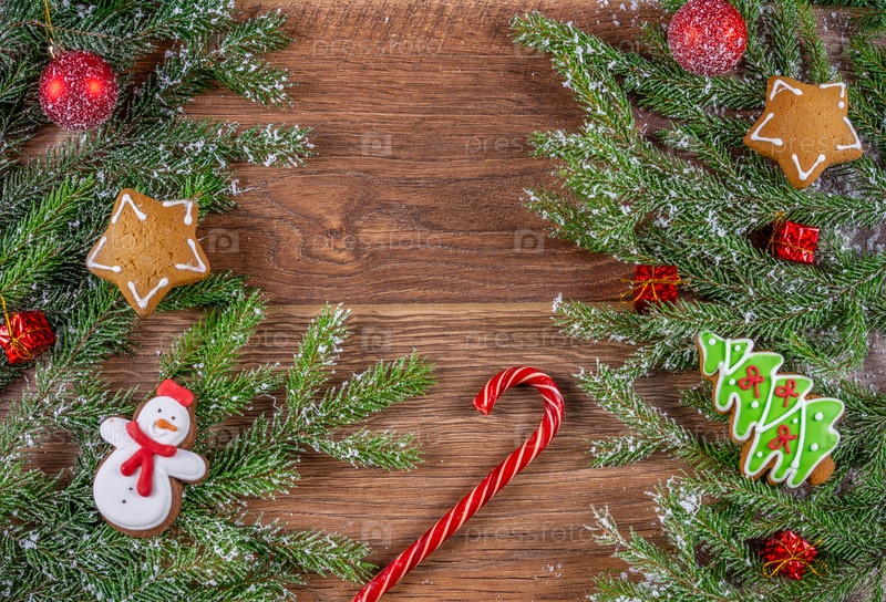 Рождественская открытка, рождественские поздравления, фон с елочными шарами и пряниками