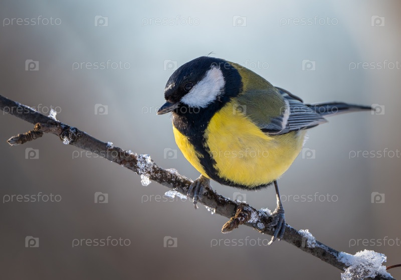 В холодное зимнее утро на заснеженной ветви красной смолы сидит птица большая мокрота, parus major