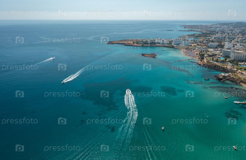 Водные виды спорта на Средиземном море в Протарасе, Кипр, вид с воздуха