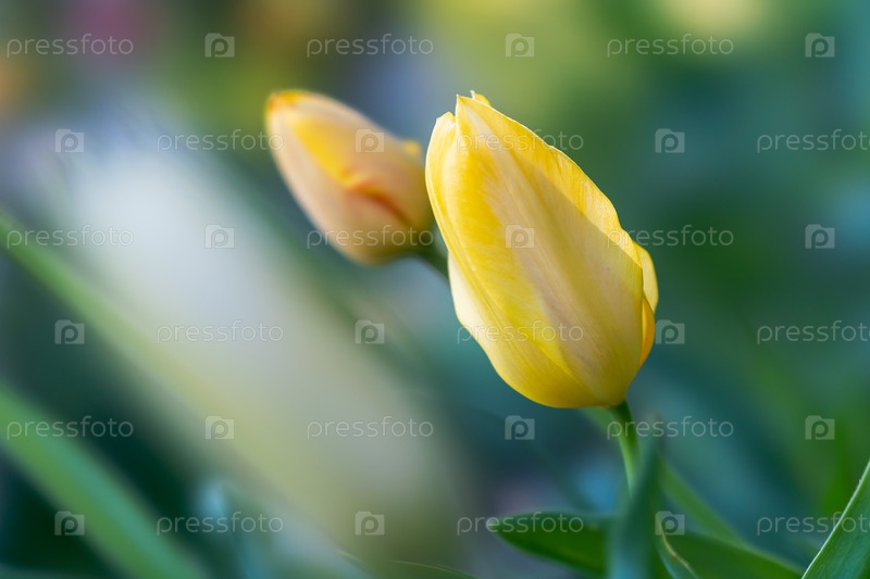 Весеннее цветение тюльпанов, желтые тюльпаны крупным планом среди цветущих деревьев
