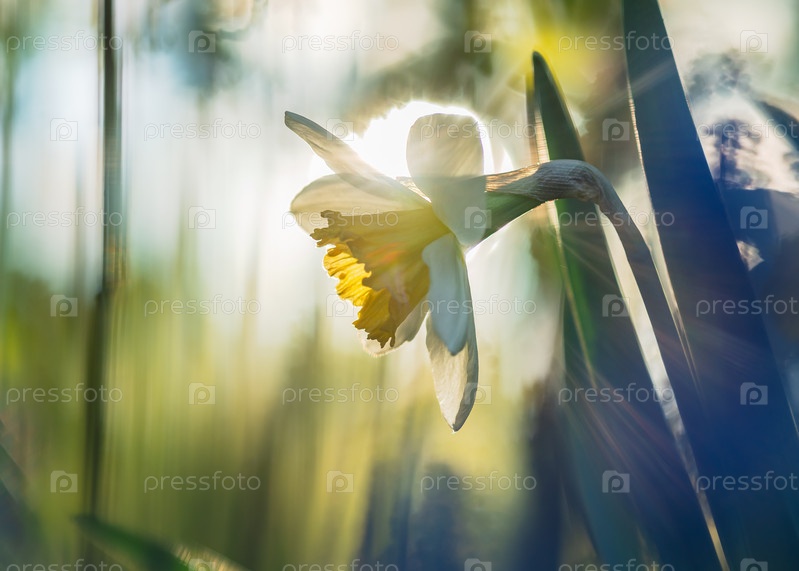 Весеннее цветение нарциссов на фоне заходящего солнца