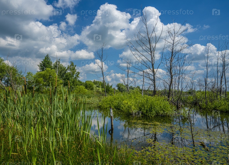 Лето, заросший зеленью пруд и сухие деревья в центре пруда на фоне голубого неба