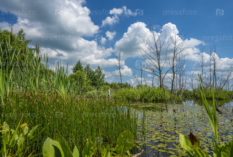 Лето, заросший зеленью пруд и сухие деревья в центре пруда на фоне голубого неба