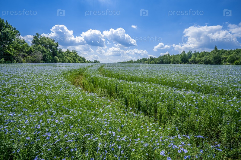 Дорога идет через поле цветущего льна на фоне голубого летнего неба