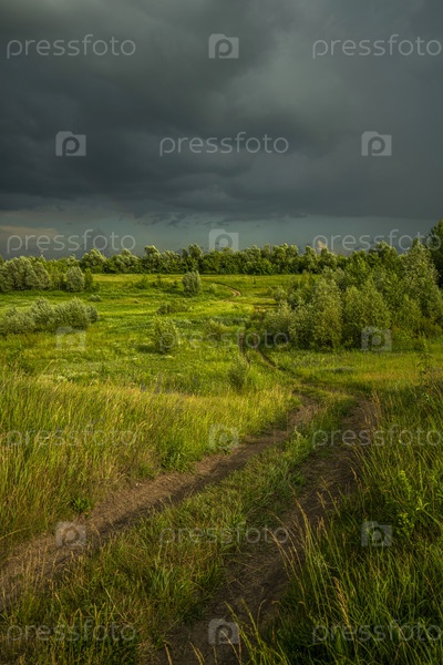 Извилистая грунтовая сельская дорога, идущая по освещенному солнечным светом лугу, а над ней грозовое небо со свинцовыми тучами