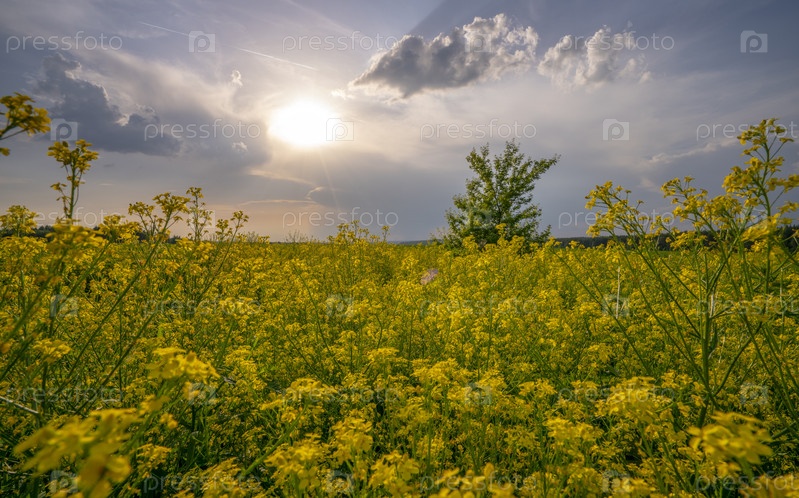 Поле цветет желтыми цветами рапса в свете контура на закате