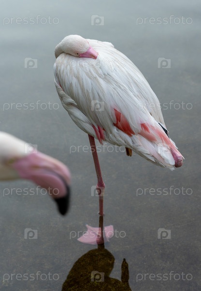 Розовый фламинго стоит на одной ноге в воде