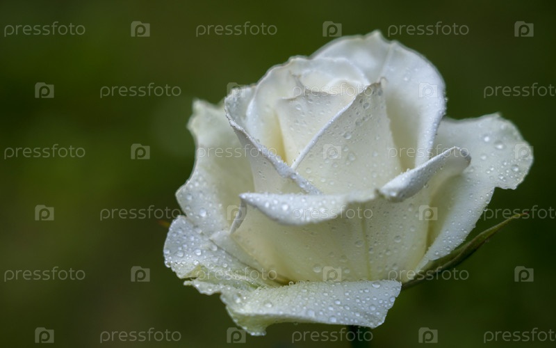 Белая роза в каплях росы крупным планом на фоне размытой зелени